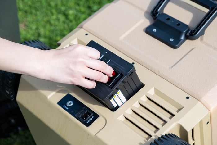 別売りのバッテリーを使用することで、給電なしでの使用が可能。最大15時間、コードレスで冷蔵庫を稼働させることができます。