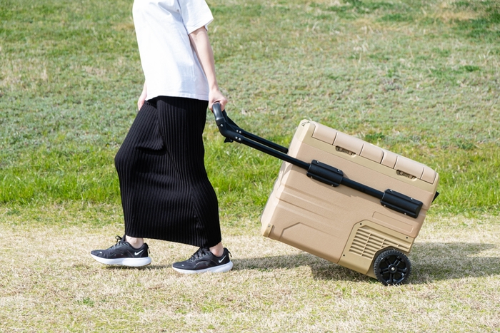 ICEBERG 45Lは、本体前面に伸び縮みするハンドルを設置、片方の底面には直径15cmの車輪を設置しているため、キャリーバックのように車輪で地面を転がしながら、持ち運ぶことが可能。女性でも持ち運びしやすいデザイン設計を採用しました。