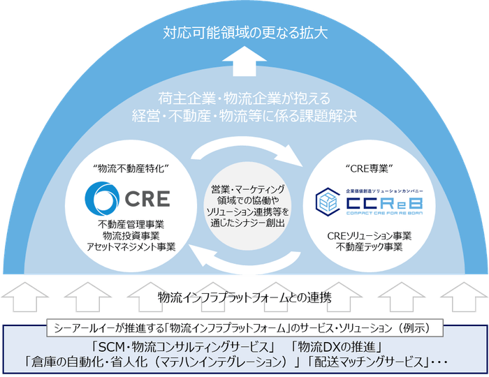提携により、当社は、約60年※の業歴を持つシーアールイーの豊富な顧客基盤に対して「CRE戦略構築・実行支援サービス」を提供することで更なる事業の拡大を目指します。シーアールイーと協業することで、企業の有効活用ニーズに対して同社のマスターリース事業と連携したCRE戦略提案を行うなど、ソリューションの幅を広げるとともに、シーアールイーのグループ企業(資本業務提携先・アライアンス先を含む)の持つSCMコンサルティングサービスや物流DXサービスなどの不動産領域を超えたサービスと、当社の独自のテックシステム及び蓄積したデータを掛け合わせることで非不動産ビジネスにまで領域を拡大して事業を展開して参ります。すでにマーケティング領域において一部協業を開始しておりますが、今後、シーアールイーが運営する物流インフラプラットフォームサイト「ユアロジ」と、当社が運営するB2Bポータルサイト「CCReB GATEWAY」の相互連携の開始を予定しており、顧客企業に提供するサービスの幅を広げて取り組んで参ります。