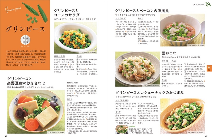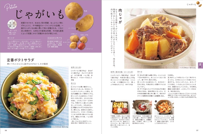 肉じゃがやロールキャベツなど、主菜になる野菜のおかずも充実。また、野菜を使った炊き込みごはんや混ぜごはん、パスタやめんなどのレシピもいろいろ。全レシピにカロリーと塩分を表示しています。