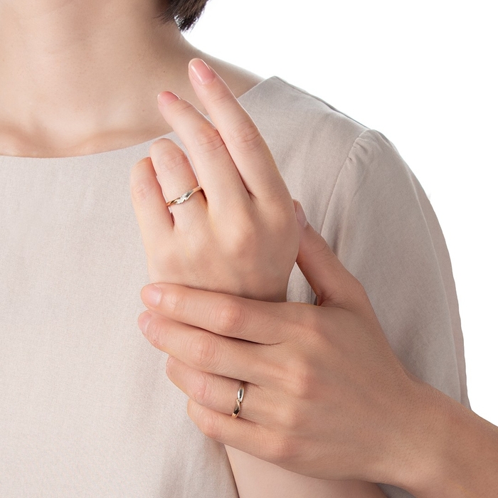 このほどの新作婚約指輪『Unire -ウニーレ-』は、あえて石留めの高さを抑えており、引っかかりが少なく普段使いしやすいデザインです。結婚指輪『Affinita -アフィニタ-』は、近年の店頭調査によりますと、コンビリング(2種類の素材を使用した指輪)の人気が高まっていることから、自社配合の落ち着いた色味のピンクゴールドをワンポイントで使用し、肌馴染みよく身に着けられるように開発しました。ゴールドとプラチナのコンビカラーは、普段ゴールド色のアクセサリーを身に着ける方も身に着けやすく、かつ一部にプラチナ色が入ることで結婚指輪らしさも感じられるとの声があり、人気が高まっています。