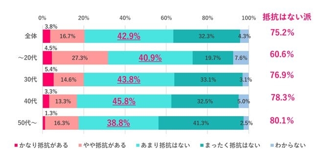 年代別で比較すると、若年層の方が抵抗を感じる割合が高く、年代が上がるにつれ「抵抗はない派」の割合が増加する傾向がありました。社会人経験が長くなると上司が年下のケースも増えていくので、抵抗がなくなると予想されます。
