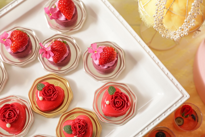 フランス王妃マリーアントワネットが、花々が美しく咲くプライベートガーデンでお茶会を楽しんでいる、女性憧れのシチュエーションを表現。美しく咲く花々と、春に旬を迎える蜂蜜をふんだんに取り入れたデザートブッフェに仕上げました。ムースの中に苺のジュレを入れ、苺の甘さを楽しんでいただける“ストロベリームース”は真っ赤な薔薇をイメージした見た目にも可愛い一品。また、 “蜂蜜フロマージュムース”は、フワッとした食感で、蜂蜜の甘さとさっぱりとしたクリームチーズの味わいが楽しめるパティシエ一押しのスイーツです。美しいシャンデリアやこだわりのアンティーク家具など、フランスのお城をイメージした会場内で、暖かな木漏れ日が降り注ぐ優雅なスイーツタイムをお楽しみいただけます。