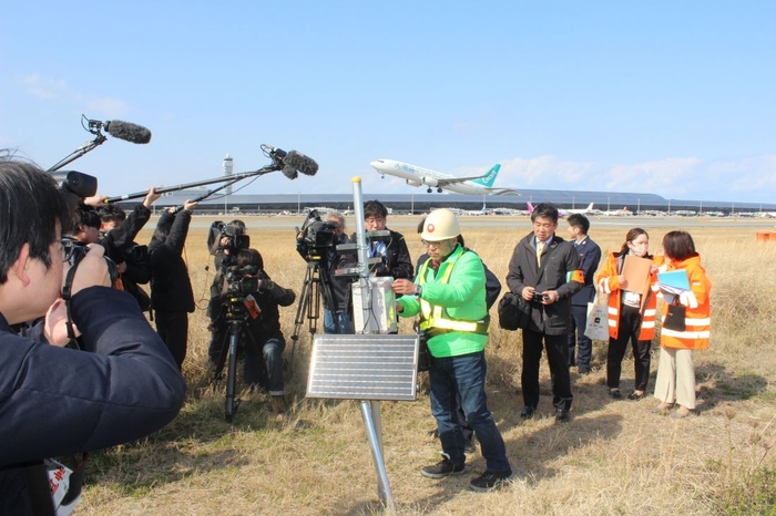 この日、関空では辻教授と、装置を開発した山梨県の自動車部品メーカー「T.M.WORKS」の渡邊孝夫さんが滑走路から約100㍍離れた緑地帯に鉄製の支柱を立てて、電源用のソーラーパネル、バッテリー、バードソニック本体とスピーカーなどを手際よく取り付けていきました。頻発するバードストライクは日本の空の玄関口の安全に直結する問題だけに、大勢の報道関係者が取材に詰めかけました。