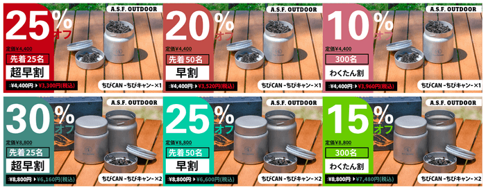 主にキャンプギアの企画・販売を行う合同会社雲鶴堂(所在地:埼玉県川越市、代表:劉承宇)は、この度、当社アウトドアギアブランド「A.S.F.OUTDOOR」から登場し、応援購入サイト「Makuake」にて総応援額130万越えと好評を博した、独自の滑り止め付きで大きくなった一生モノの純チタン二層式お椀『Bowan2』と、携帯性抜群の純チタン製密閉キャニスター『ちびCAN -ちびキャン-』がお得になって「わくたん」へ掲載決定。