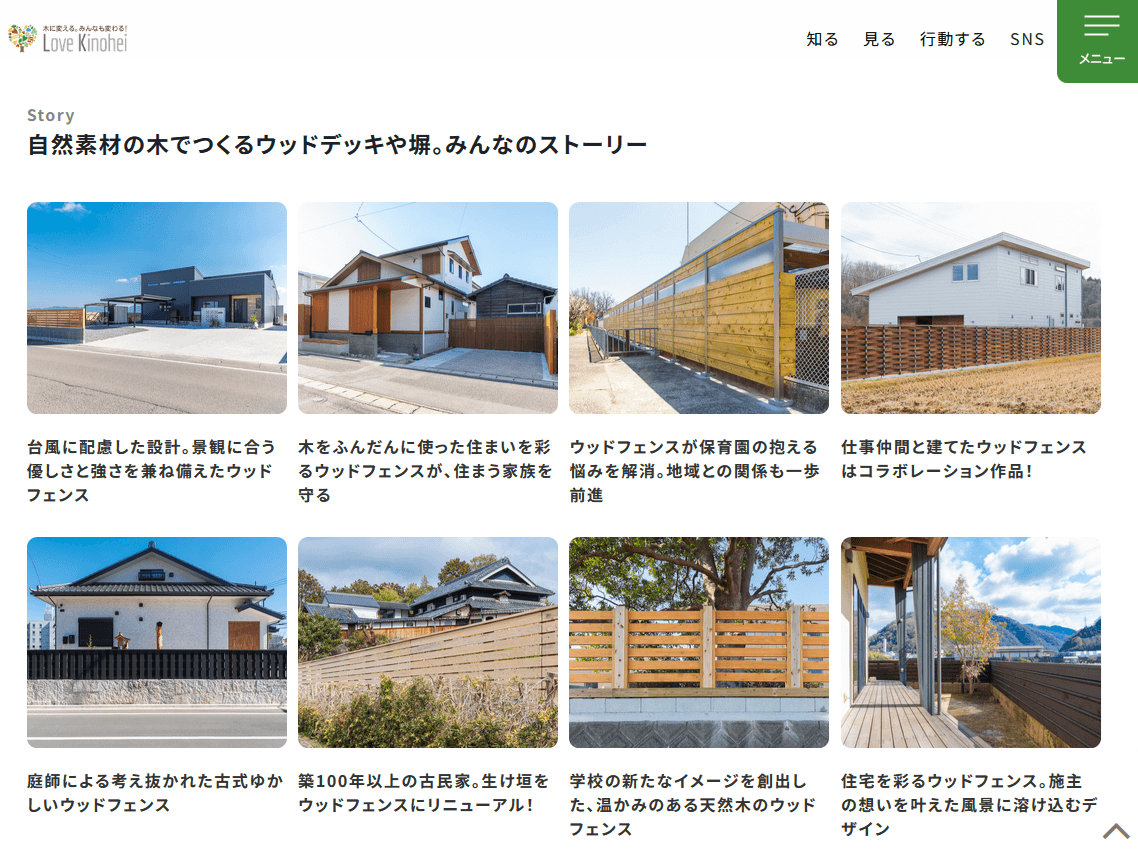 そこで、ラブキノヘイでは、これまであまり使われてこなかった木の塀(ウッドフェンス)やデッキ、カーポートなどのエクステリアでの導入事例を中心に、木の家や、国産材を使った雑貨や、都市部の施設等での木材利用など、“木のある暮らし・木の街づくり”のヒントとなる情報を「知る」「見る」「行動する」の3アクションごとに、ご紹介しています。