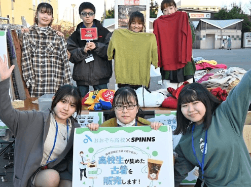 「古着を古着で終わらせない」というテーマのもと、昨今環境問題としてあげられている不要衣類の廃棄による焼却、埋め立て問題を解決すべく2021 年度より全国のキャンパスに「古着回収ボックス」を設置。 回収した古着をファッションブランドのSPINNSさんが選別し再販売・リメイク販売をおこない、新しいユーザーの手に届け、再循環させる取り組みです。2022年度は、生徒運営「おおぞらSDGs」instagramアカウントの運用開始し、東京ビッグサイト「古着フェス」や、北九州新幹線開通イベント「千年夜市」、京都循環フェス、佐賀がばい肉フェスなど、全国各地のイベントにて集まった古着を販売しました。