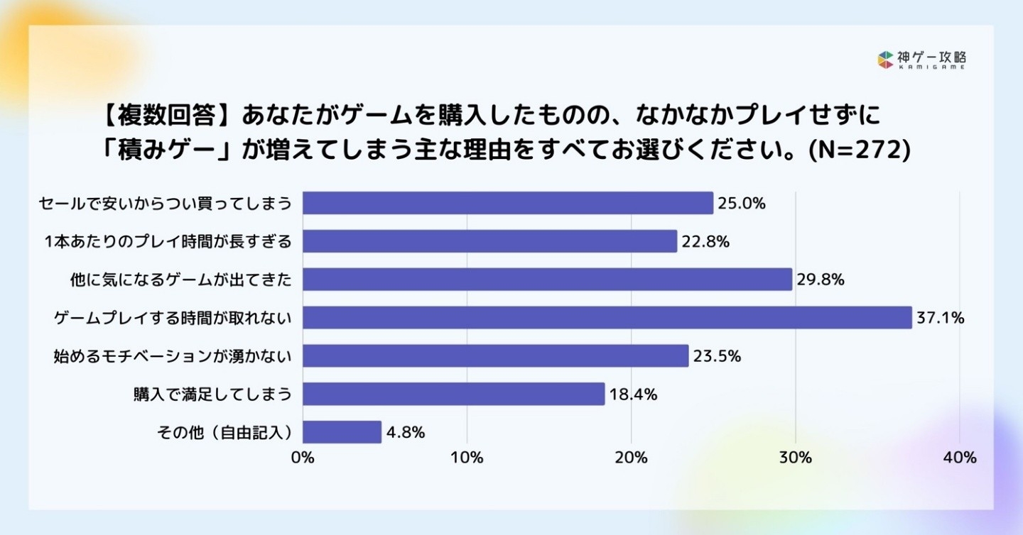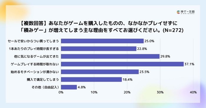 積みゲーが増えてしまう理由では、「ゲームプレイする時間が取れない」が37.1%でトップ、次点で「他に気になるゲームが出てきた」が29.8%でした。