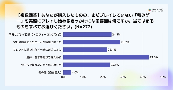 まだプレイしていなかった積みゲーを実際にプレイし始めるきっかけになる要因は、「連休・空き時間ができたから」が43%でトップでした。