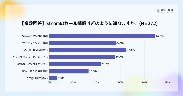 Steamのセール情報は、Steamアプリ内の通知で知るという人が44.5%で最多でした。次点はXやRedditなどのSNSが32.4%という結果でした。