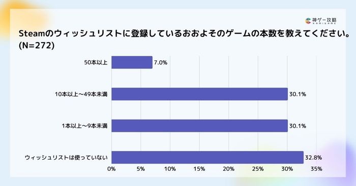 ウィッシュリスト(※)に登録しているゲームの本数は、「使っていない」が最多で32.8%、「10本以上〜49本未満」「1本以上〜9本未満」が同回答数で30.1%という結果になり、ウィッシュリストを使用している人は全体の67.2%でした。