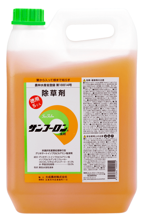 サンフーロンは葉から吸収されて根まで枯らすタイプの除草剤です。有効成分はアミノ酸由来で、所定の時期と倍率で散布すれば、一年生雑草から多年生雑草、ススキ・ササ類まで根まで枯らすので、除草効果が長く確実です。品質、効果、安全性、残留性など、30項目余りに及ぶ審査をパスして農林水産省から農薬登録を受けた商品なので、安心してお使いいただけます(人畜・ペットや土壌・環境汚染に対する安全性も、公的機関の試験で認められています)。野菜類、お米、豆、小麦、果樹類など、多くの作物で登録があるため、幅広い作物に対応しています。500ml 1本で約1反(1,000m2)分使える上に、ジェネリック農薬なので、価格もお求め安く、経済的です。