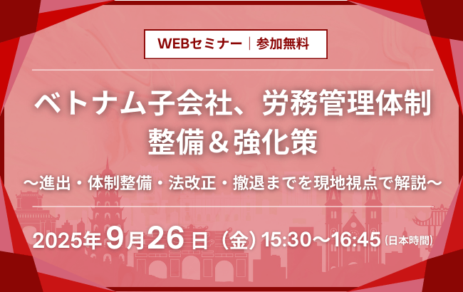 みらいコンサルティンググループ(本社:東京都中央区、代表:久保 光雄 岡⽥ 烈司)は、2025年9月26日にセミナー『 ベトナム子会社、労務管理体制整備&強化策』をWEBにて開催します。