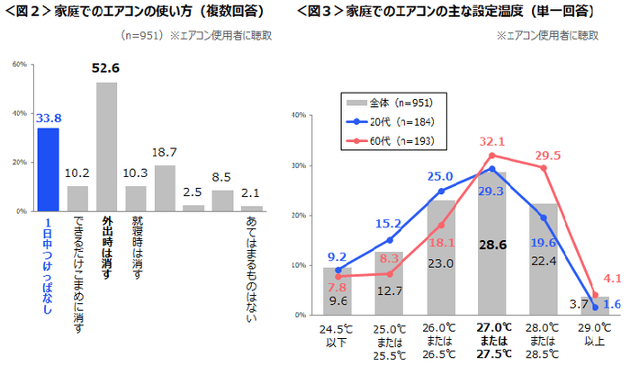 エアコンの設定温度は「27.0℃ または 27.5℃」が最も多い。60代では、20代に比べ設定温度はやや高めの傾向がみられる。