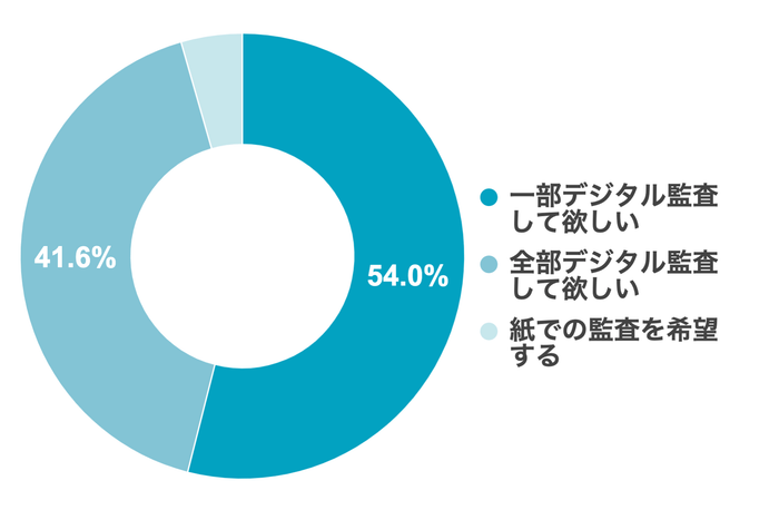 デジタル監査の経験ある・なしの区別なく回答していただいたQ1でも、部分的な実施を希望が54%、全部を希望が41.6%という結果だったので、現時点では紙との両輪が主流のようです。