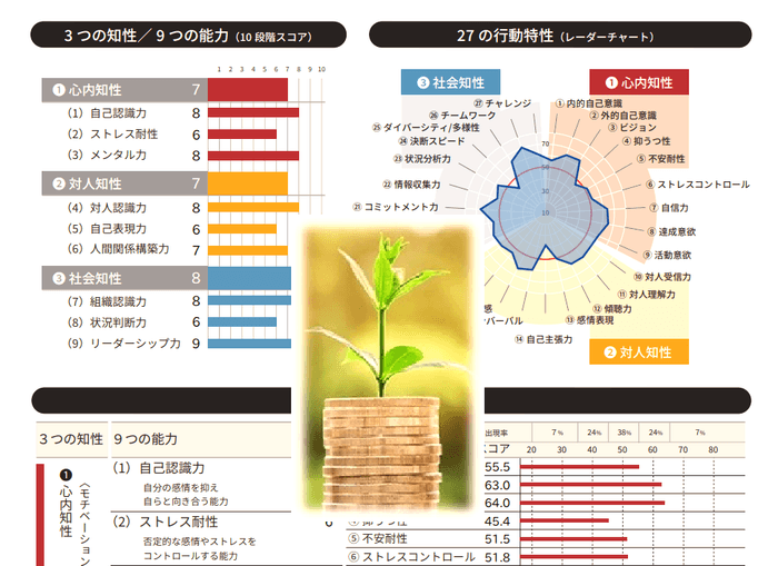 3つの知性、9つの能力、27の行動特性を見える化して、あなたの現在のお金に関するEQを把握することができます。