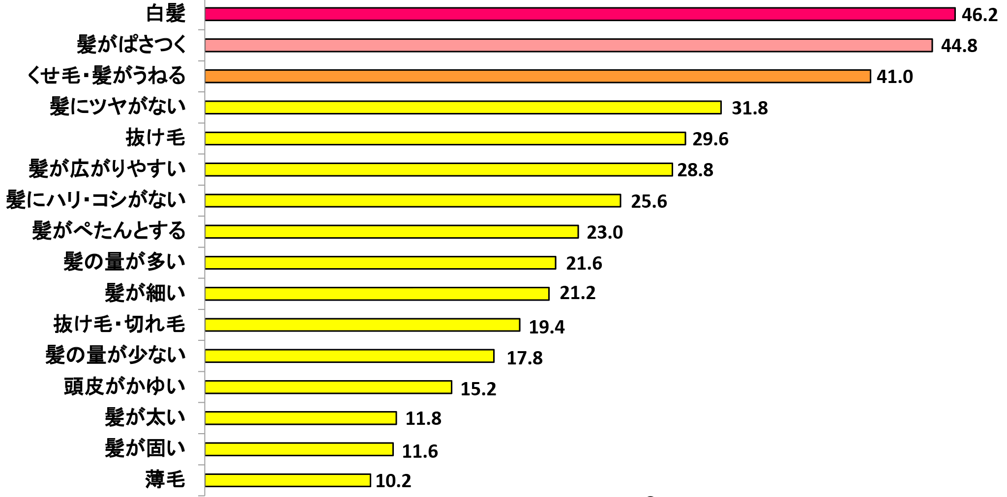 年齢を重ねるといろいろな部分に悩みが増えてくるもの。髪の悩みも例外ではありません。ポーラの調査によると、50歳以上の髪の悩みは、白髪、髪のツヤ、抜け毛、ハリコシ不足などの悩みが上位を占めます。カラーリングやヘアケア製品だけにとどまらず、ウィッグへのニーズもさらに掘り起こせると推察されます。