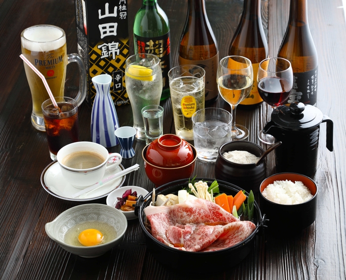 平日限定のランチは1,000円税込み。近江牛のローストビーフ重やすき焼き、和牛粗挽きハンバーグや地鶏の鉄板焼き。すべてリーズナブルな料金で提供しており、すき焼き(ディナーのみ)はお一人様のご利用でも可能で、アルコールの飲み放題もお一人様より可能です。