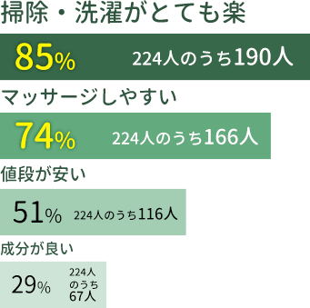 アンケート結果には「マッサージしにくい」という回答は1つもありませんでした。 水溶性というメリットがありながら、マッサージのしやすさだけを比べても、ご好評をいただいています。