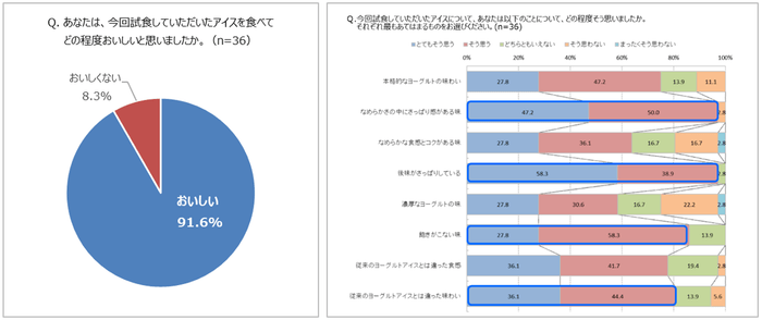 本商品の発売に向けて、全国の20代~50代の男女を対象に、商品への感想を調査しました。その結果、91.6%の人が「おいしい」と回答しました。味の印象については「なめらかさの中にさっぱり感がある味(97.2%)」、「後味がさっぱりしている(97.2%)」、「飽きがこない味(86.1%)」、「従来のヨーグルトアイスとは違った味わい(80.5%)」と回答した人が多い結果となりました。開発時にこだわった、濃厚感とすっきり感の両立を実感していただける商品になっています。