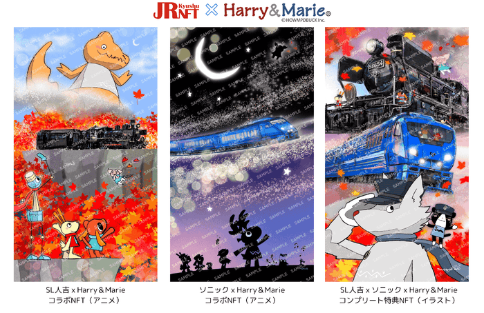 「ソニックxSL人吉xハリー&マリー コラボ「秋」」デザインの2種類の「JR九州NFT×Harry&MarieコラボNFT」をお買い上げで、コンプリート特典NFTをプレゼント!
