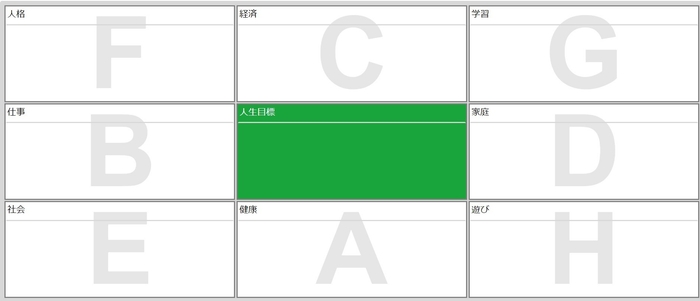 SELFingシートには「人生目標」(人生を通した目標設定)と「3年後の自分」(短期の目標設定)の2種類があり、「人生目標」シートは、真ん中に「人生目標」、周囲8マスには人生を構成する8大分野「健康」「仕事」「経済」「家庭」「社会」「人格」「学習」「遊び」が設定されています。「3年後の自分」シートは、主に人生目標シートの「仕事」で設定した目標から発展させて作成します。
