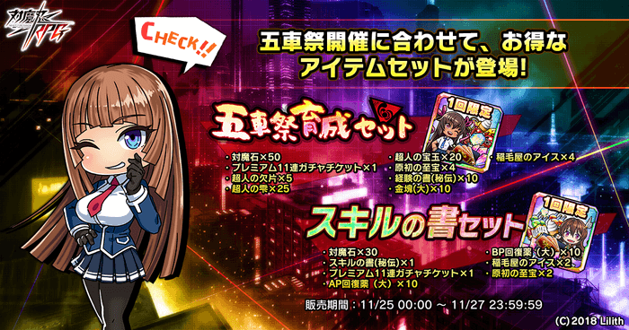 『対魔石(有償)×50』の他、『プレミアム11連ガチャチケット×1』、『超人ユニットの覚醒素材』等の育成セットが含まれた、五車祭期間限定のお得なセットになっております。
