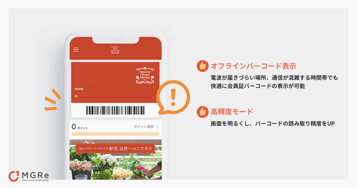 MGReはオフラインバーコードを採用しているため、電波が届きづらい場所、通信が混雑する時間帯でも快適に会員証バーコードの表示が可能です。また、高輝度モードでバーコードの読み取りも手間なくスムーズに、レジ前をもたつかせない利便性の高い機能を備えています。駅ナカに多くショップ展開している「青山フラワーマーケット」アプリでもこの機能を採用しています。