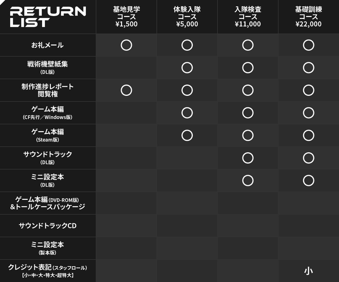 お気持ちからご支援いただける「基地見学コース」から、ゲーム内に支援者様ご自身が登場する権利が付属した「衛士任官コース」まで、幅広いラインナップから選択いただけます。