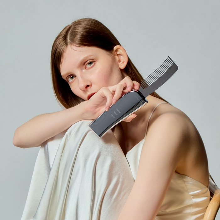 (3) 従来の浸透促進器に見られるアイロン型では、髪の毛1本1本の根元から毛先まで効果を与えられないことからコーム型を選択。摩擦でキューティクルやお肌が傷つかないよう、クシ歯と「カッサと命名したクシの背部分」は職人の手でひとつずつ研磨しています。カッサ部分はポレーション美顔器として美容成分の導入使用が可能です。
