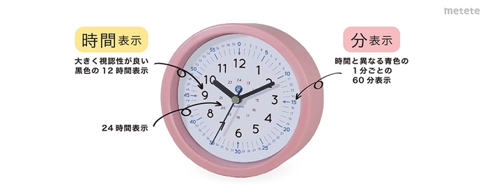 初めての時計にピッタリ!「時間」は、大きく視認性が良い黒色の12時間表示と、24時間表示付き。「分」は、1分ごとの60分表示で、時間表示と異なる青色を使用。時計の基本がギュッと詰まっているから、これひとつでしっかり時計の読み方がバッチリ!