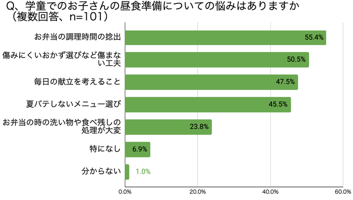 ●学童保育で昼食準備をする際に、悩みのない方は少なく、”調理時間の捻出”や”傷みにくいおかず選び・工夫”などについて、約半数の方が悩んでいる結果でした
