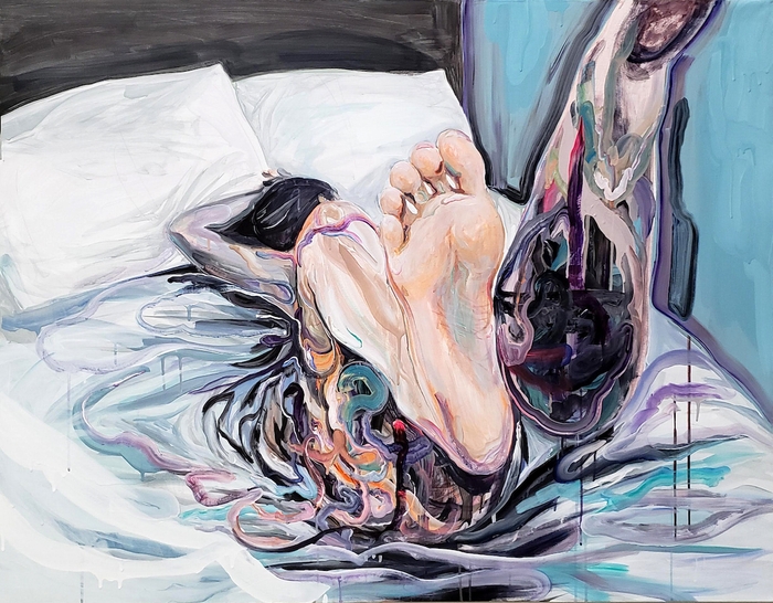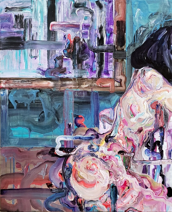 人体の範囲を曖昧に描くことで、物理的な形とは別に日々変化する人格や存在自体の姿を捉え直し、その営みの美しさを作品にすることで体を持って生きることへの希望を生み出せるようにと願っています。絵画表現としては色味や筆触によって肉感や温度感を表現することを目指しています。