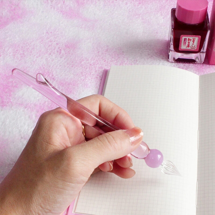 すらりとしたフォルムとクリアピンクの色味が優美な、岩下の新生姜をイメージしたガラスペン。トップ部分は岩下の新生姜そのままをモチーフにした造形で、ぴょこっと飛び出た新芽の部分がガラスペンを置いた時の転がり防止にもなる、美しくて機能的なデザインです。
