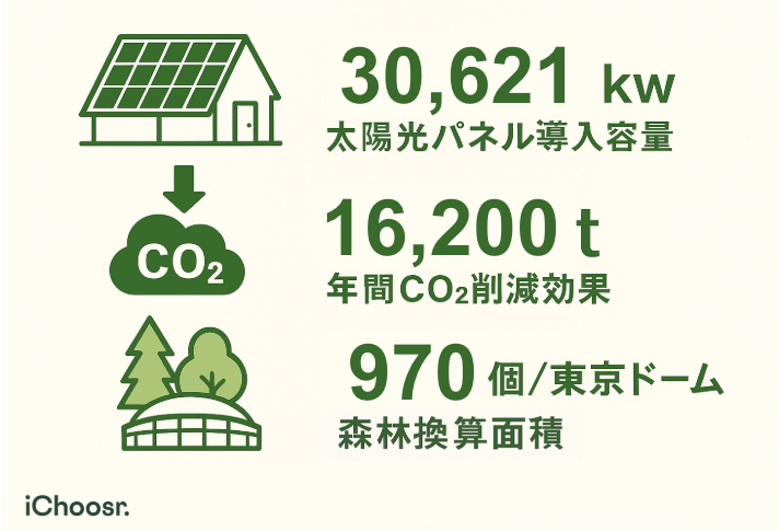 2019年に日本で開始した「みんなのおうちに太陽光」事業により、これまでに設置した太陽光パネルによる年間のCO₂排出削減量は約16,200トンです。これは森林のCO₂吸収量で換算すると、約4,500ヘクタール、東京ドーム約970個分に相当します。