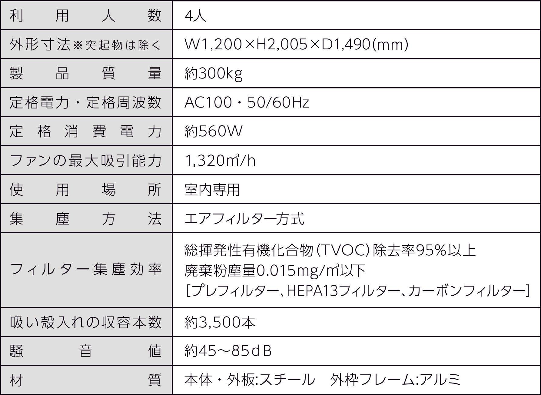 エアフィルター方式を採用し、3層の高性能フィルターでたばこの煙・臭いをしっかり除去します。総揮発性有機化合物(TVOC)の除去率は95%以上、廃棄粉塵量は0.015mg/㎥まで取り去り、厚生労働省が定める技術的基準をクリアしています。喫煙ブース内でタバコの煙・臭いを除去可能なため、屋外への排気は必要ありません。