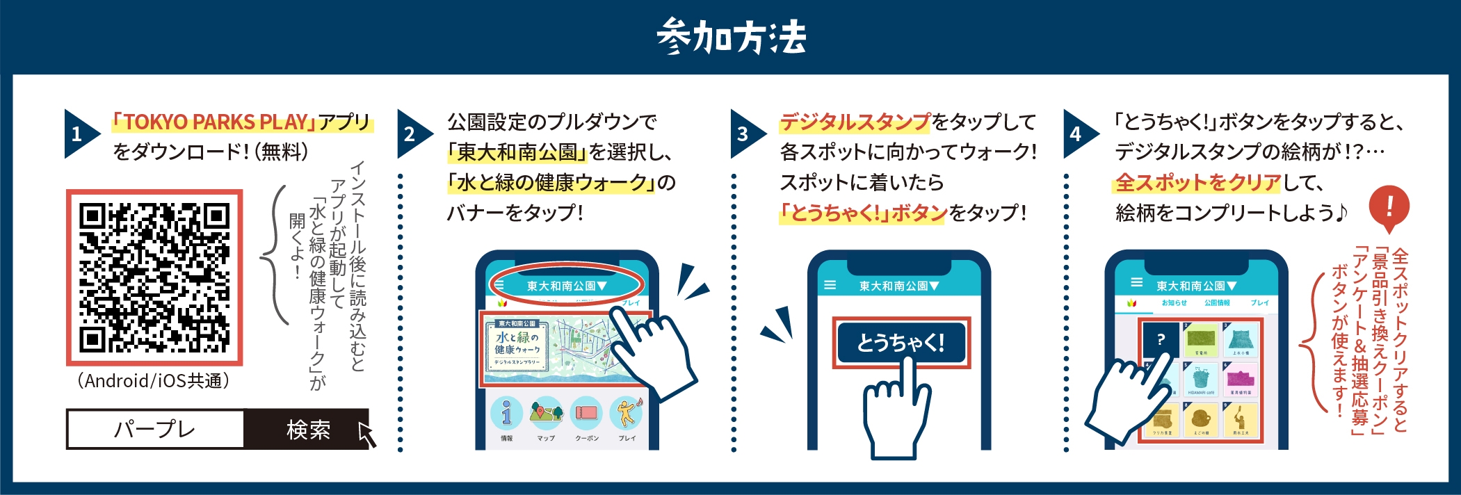 スマートフォンに「TOKYO PARKS PLAY」アプリをダウンロードしてください。