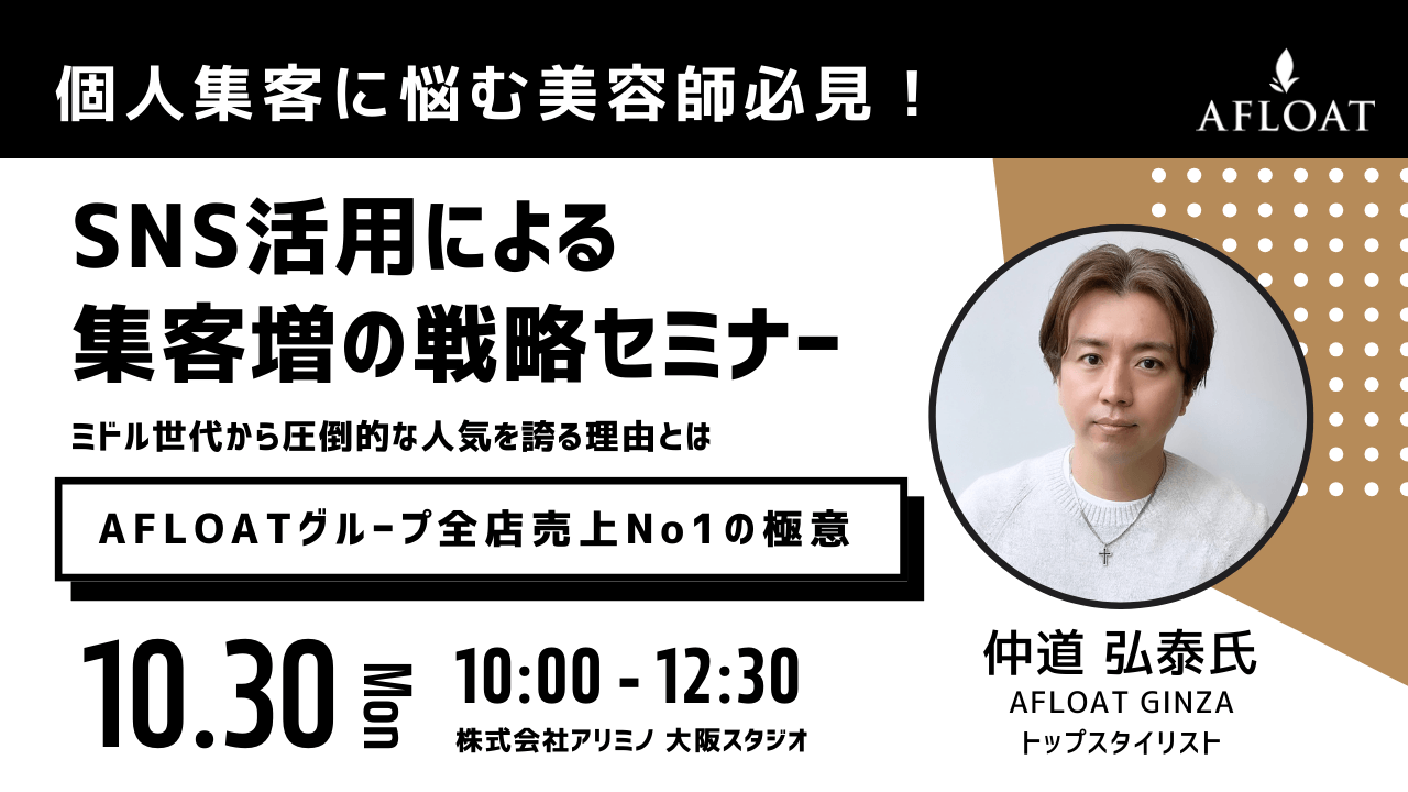 伝説の美容室AFLOATで月間売上No.1の「仲道 弘泰」が 集客UPのためのセミナーを10月30日(月)、大阪で初開催 ~ミドル世代こそ活躍のチャンス~