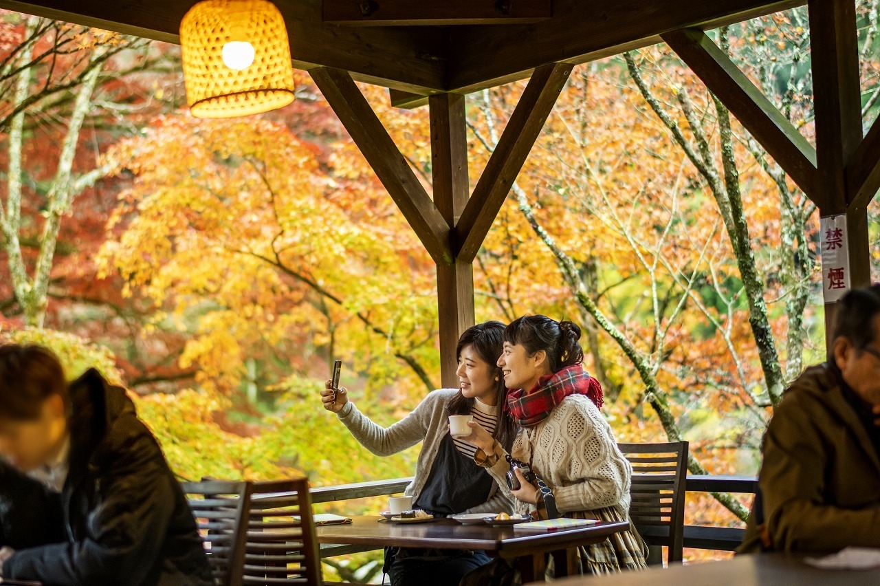 鮮やかに染まる紅葉に、雪のように吹雪く薄紅の桜…小原の秋は、幻想的な景色が広がっています。季節外れのように感じる桜の正体は「四季桜」といい、春はもちろん、秋の終わりから冬のはじめまで花が咲くという桜です。視界いっぱいに山肌をピンクに染める四季桜と紅葉の共演は、言葉を失うほど見事な光景で、特に「川見四季桜の里」は、1,200本の四季桜が見られ絶景です。