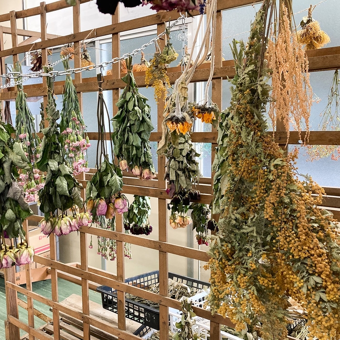 そうした行き場を失ったすべてのお花に咲く場所を作ってあげたい、ごみ箱に捨てられるお花をゼロにしたい、花農家さんが大切に育てたお花のいのちを最後まで大切にしたい。そんな想いから、JFCではフラワーロスの課題と向き合い、課題解決への取り組みのひとつとして、生花としての出荷が難しくなってしまったお花は棄てずに自社でドライフラワーにしています。