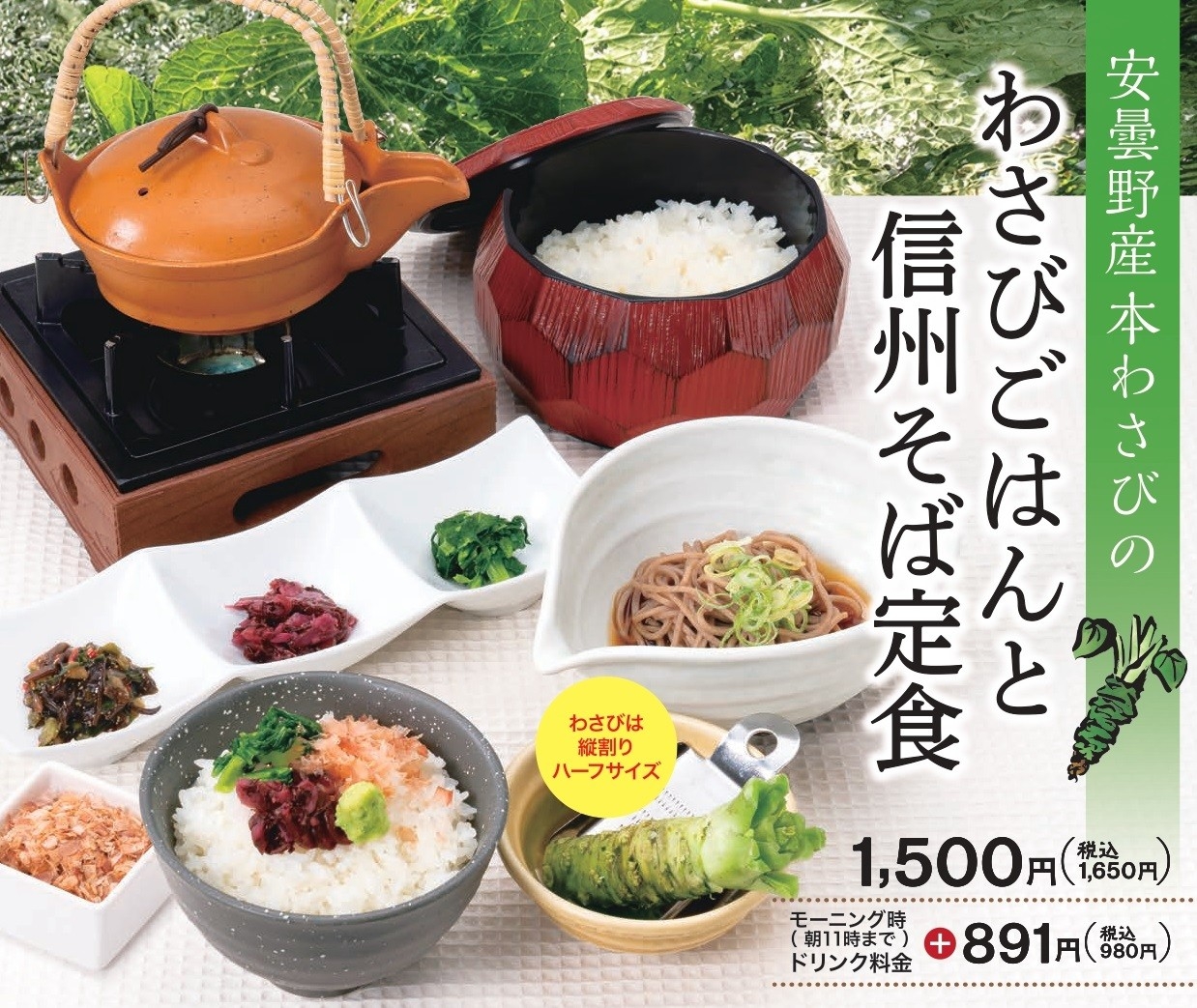 安曇野産の本わさびを使って信州のお米やそばを食べれるプレミアム定食です!