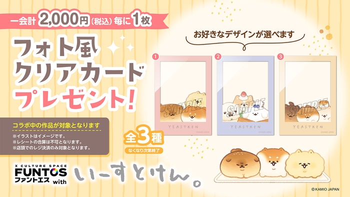 レジでのお会計2,000円(税込)毎に1枚、お好きなデザインのフォト風クリアカード(全3種)を1枚プレゼントいたします。