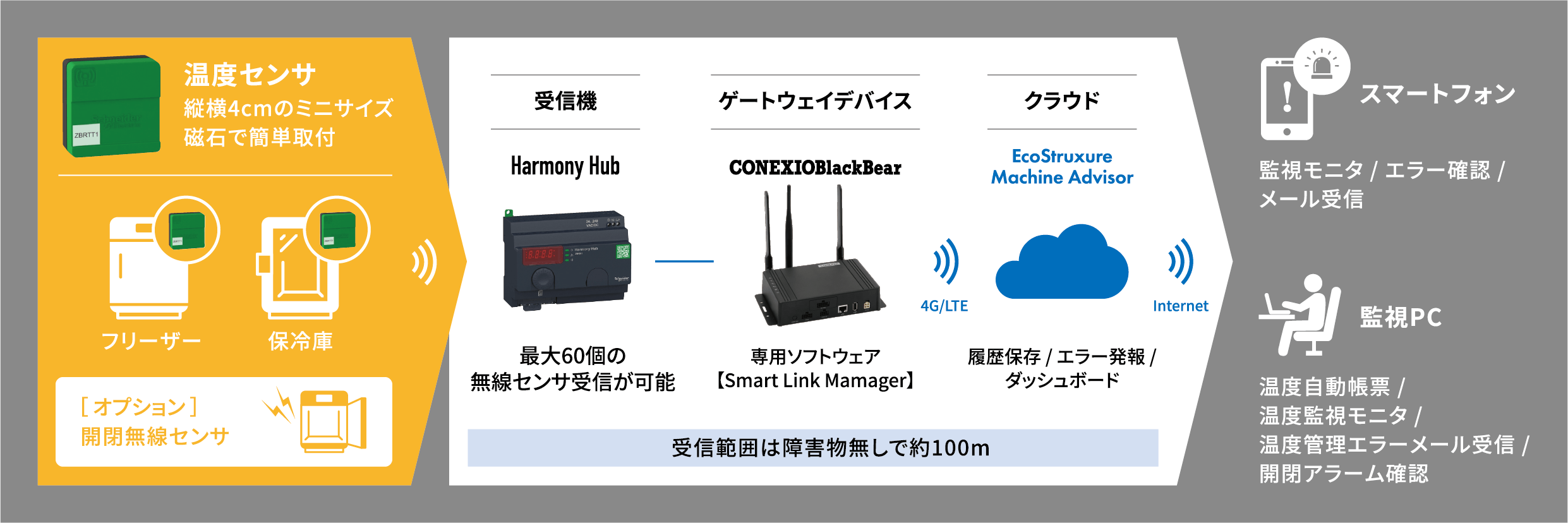 本ソリューションは、主に自社の冷温設備(冷蔵庫、保温庫、冷凍庫、保冷車)の温度チェック、記帳作業を省力化したい医薬品/化学/食品メーカー向けのソリューションで、温度管理を自動化、温度異常のアラート通知をするだけでなく、電力の使用状況やドアの開閉も含めた設備の遠隔監視へ、容易に機能を拡張することができます。