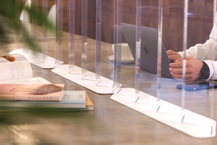 飛沫拡散防止パーティションは企業によって様々な理念の元でデザインされている。ある企業は、厚めのアクリルを使用し安定感のあるもの、またある企業は環境を配慮した材料で簡易的なもの。このコンパクトスクリーンはまさしく後者にあたり、リサイクル可能な材料を採用し、如何に簡単に組み立てられ、収納出来るかという点に重点を置いている。本体は細く折りたたむ事が可能なので、収納時は非常にコンパクトになる。