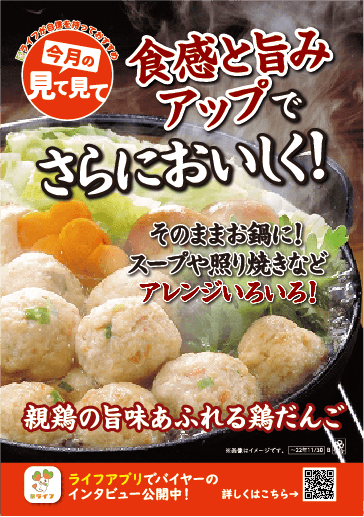 グッと気温が下がり、鍋がおいしい季節がやってきました。ライフが自信を持っておすすめする「今月の見て見て」の11月商品に選ばれた「親鶏の旨みあふれる鶏だんご」は、旨みの強い“親鶏”をひき肉にして使用することで、旨みがアップし肉々しい食感をお楽しみいただけ、鍋の具材としてぴったりな商品です。さらに、美容や健康に気をつかわれている方に人気のコラーゲンも、昨年同様たっぷり配合されております。