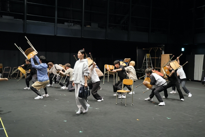この日行われたのは、冒頭から3場まで。 あることをきっかけに交錯する、学生たち、盲目の女性、娘との関係に悩む父という3つの軸に関する導入とOPのダンスシーンまでの流れだ。「流してみようかと思います」という言葉にキャスト陣から「やってみよう!」「いけるいける!」と明るい声が返り、和気あいあいとした雰囲気で稽古がスタートする。