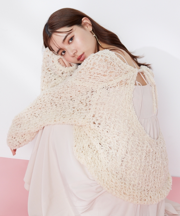 ニットプルオーバーは、背中側が大きく開き、リボンで留めるデザインで、コーディネートの女っぽさをグッと加速させます。