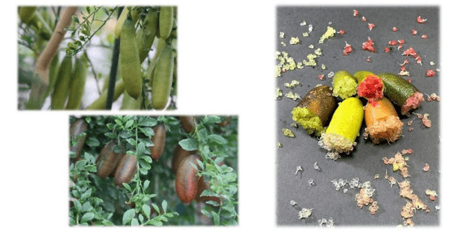 「フィンガーライム」とは指のような形をした柑橘類で、中にはキャビアのような小さな粒が多く詰まっています。長さは4~8センチほどで、色は赤や白、緑など様々です。色によって味や香りが異なるのも特徴です。