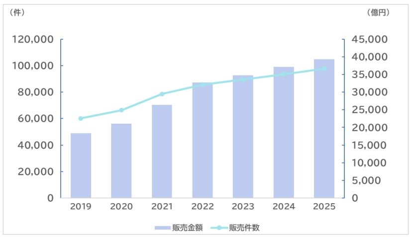 ZEH/ZEBシリーズの市場規模は、2022年度に販売件数ベースで約8万6,000件、金額ベースで3兆2,800億円になったと推定される。前年度に比べ、それぞれ9%、24%の大幅な拡大となった。金額ベースの成長率が高い理由は、建設価格が高いZEH-M、ZEBシリーズ(集合住宅やビル)の増加に弾みがついたことによる。