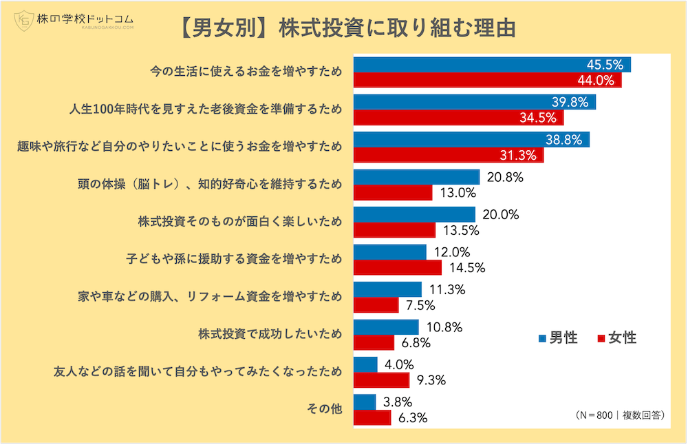 シニア世代の個人投資家に「株式投資に取り組む理由」について尋ねたところ(複数回答)、回答率が最も高かったのは「今の生活に使えるお金を増やすため」の44.8%でした。第2位は「人生100年時代を見すえた老後資金を準備するため」の37.1%、僅差での第3位は「趣味や旅行など自分のやりたいことに使うお金を増やすため」の35.0%でした。
